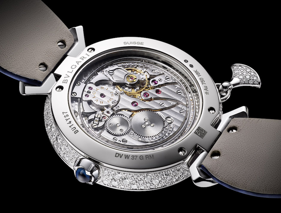 La Ref.103497 infatti ha un movimento meccanico ultra-sottile a carica manuale, Calibro BVL 362, un Ripetizione Minuti a due martelli azionato da un cursore portafortuna a forma del ventaglio, in oro bianco e diamanti: la corona è impreziosita da uno zaffiro cabochon.