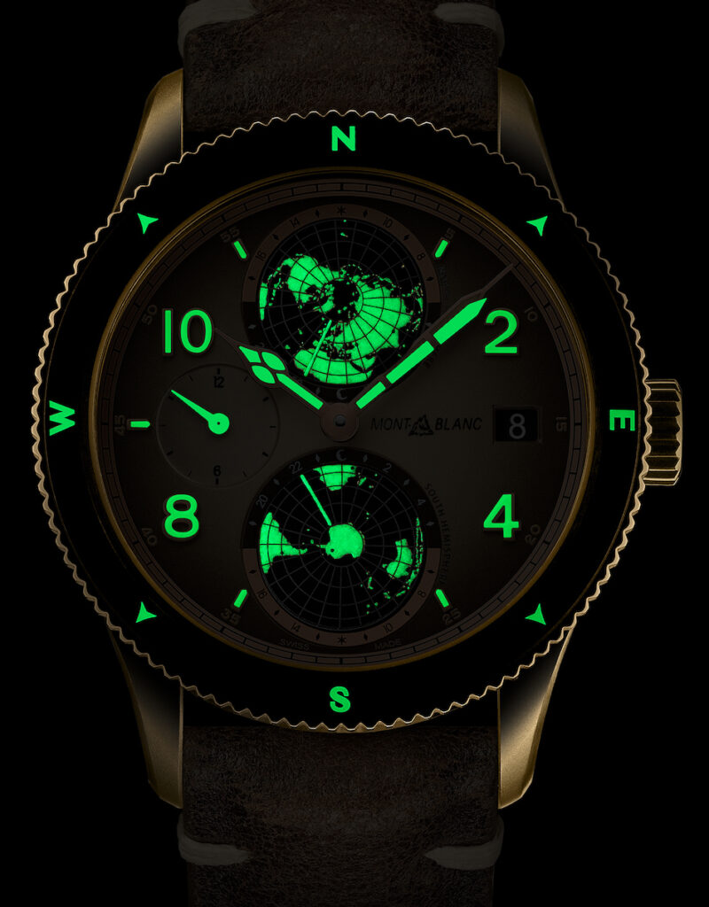 A prima vista non sembra facile impostare il movimento per l’ora universale, l’automatico Calibro MB 2925 di Manifattura (26 rubini, 28.800 A/h), ma le spiegazioni date da Montblanc sono esaurienti e le riportiamo fedelmente: con la corona in posizione 2, si regolano prima gli emisferi rotanti, allineando la linea GMT/UTC all’ora di Londra (rappresentata come una linea nera sui globi), successivamente i minuti. I due globi sono così sincronizzati. L’emisfero settentrionale ruota in senso antiorario, quello meridionale in senso orario. Il passaggio successivo è quello di allineare la lancetta delle ore all’ora locale (posizione 1 della corona, con il sistema rapido di regolazione degli incrementi orari/i globi non ruotano); in questo modo si regola anche la data. Infine, il secondo fuso orario, utilizzabile per l’ora del proprio paese, è collocato a ore nove e può essere impostato con un correttore a ore 10.