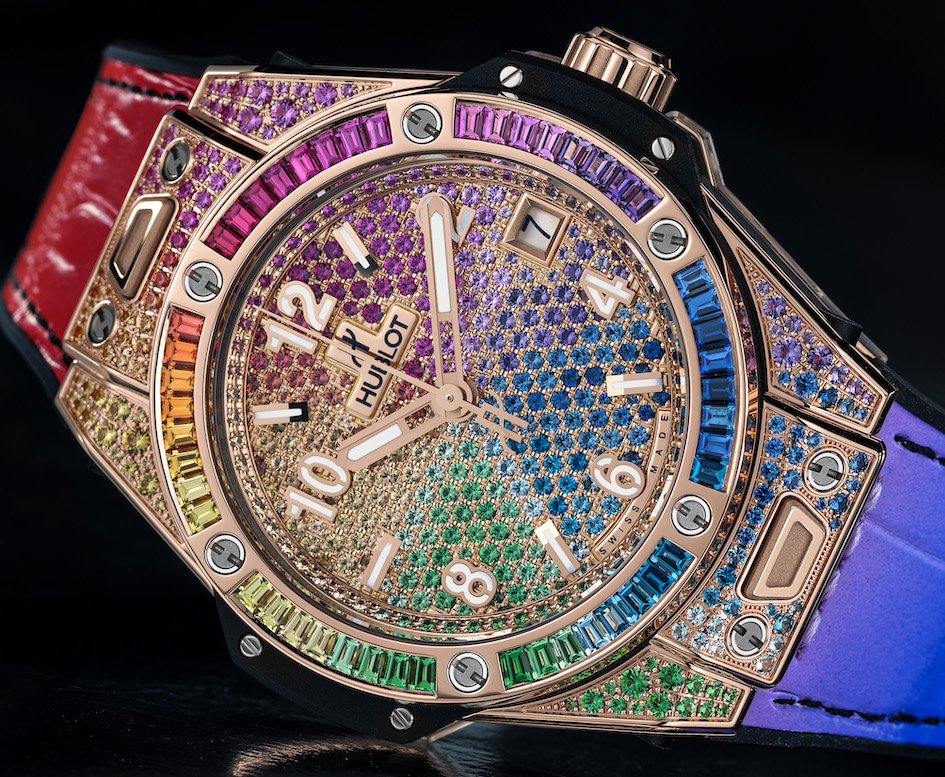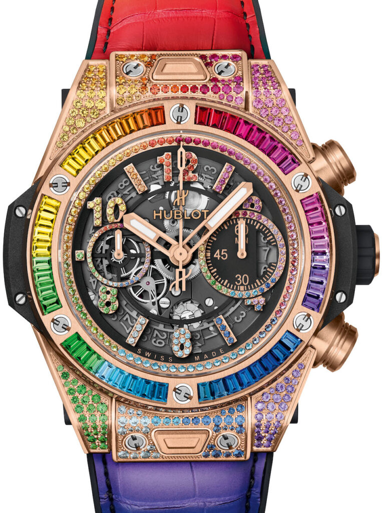 La Marca ginevrina, per l’occasione, ha puntato soprattutto sui Big Bang Unico & Big Bang One Click Rainbow; con le pietre preziose che disegnano i colori dell’arcobaleno su quadranti, lunette, casse King Gold (ma anche acciaio), anse (e bracciale). Le pietre incastonate sul Big Bang One Click Rainbow ø 39 mm (movimento automatico Cal.HB 1710) sono 425 con taglio brillante, identico taglio anche per le 388 sul cronografo automatico fly-back Big Bang Unico Rainbow ø 45 mm, movimento Cal, HUB1242.