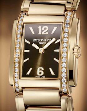 La nuova versione al quarzo (ricordiamo che anche in questo caso si tratta di movimenti di Manifattura) ha la cassa rettangolare in oro rosa; proprio questa cassa è stata l’apripista nel 1999 per il Patek Philippe nato esclusivamente per le donne che cercavano un orologio perfetto in ogni occasione durante le 24 ore. La Ref.4910/1201R presenta un quadrante colore bruno cioccolato lavorato a soleil, la cassa, ø 25,1×30 mm in oro rosa ha una doppia fila di 17 diamanti, sul quadrante indici in cifra arabe o a trapezio applicati e lancette a bastone in oro rosa, movimento al quarzo Calibro Patek Philippe E15 (6 rubini, 57 componenti). Si completa così l’offerta di pochi mesi or sono con i Twenty-4 al quarzo in acciaio e quadranti blu o grigio soleil.
