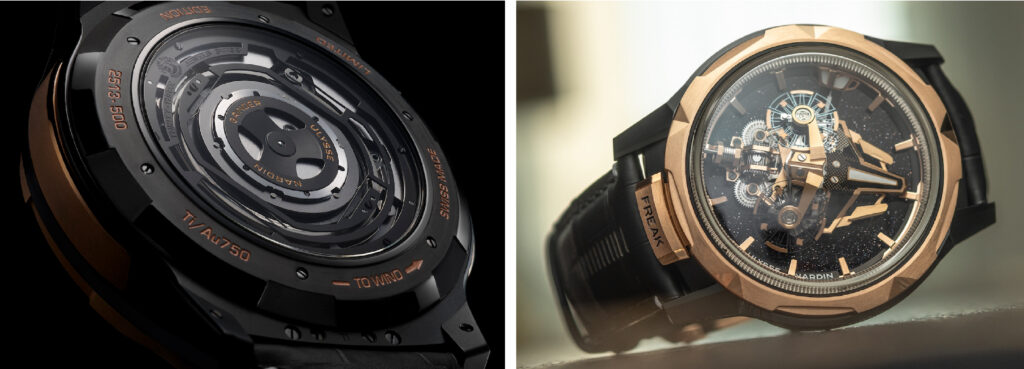Senza dimenticare la trilogia degli Ulysse Nardin dedicati a Galileo, Keplero e Copernico. Di questa Maison, che ha realizzato anche il Moonstruck, vogliamo ricordare la più recente realizzazione di quest’anno il Freak Ref 2515-500LE-2A-Black-5N/1A, un segnatempo pensato per Odissee spaziali a cominciare dall’estetica, con il nuovo Calibro UN/251 e rotazione del movimento in un’ora, con carosello volante, indicazione ore e minuti; la carica è automatica con sistema Grinder con lame, guida flessibile e ammortizzatore; doppio bilanciere inclinato XXL in silicio con blocchi d’inerzia e differenziale verticale; A/h 18.000, carica 72h, disco orario platina decorativa del movimento in avventurina nera; cassa in ceramica nera, titanio DLC o oro rosa 5N ø 45 mm, lunetta oro rosa 5N, fondello in titanio aperto sul movimento; volendo si può chiedere la carica manuale con lunetta posteriore. L’edizione questo Freak è limitata, gli esemplari previsti sono 75 e di questi 40 verranno realizzati nel 2022.