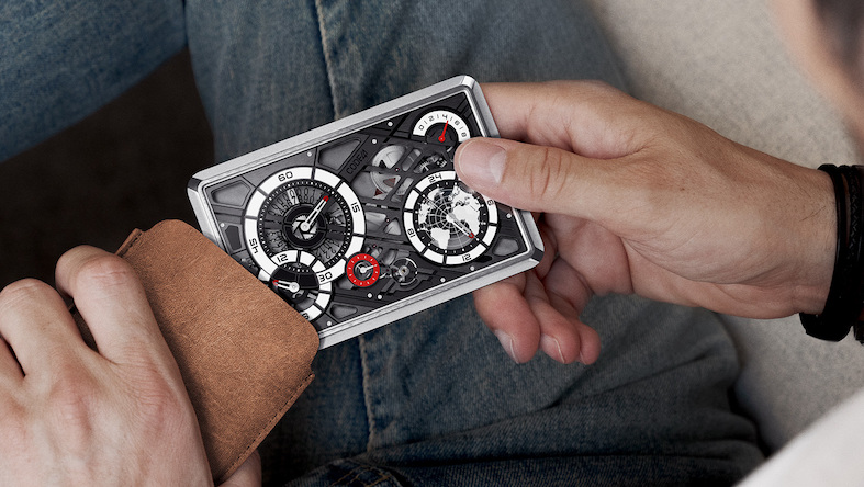 Non è un orologio da polso, può essere appoggiato su un tavolo o riposto nel taschino di una giacca maschile, un po’ come se fosse un cellulare (dall’evoluzione all’involuzione?); sicuramente è un oggetto-segnatempo con molti elementi di design, dimensioni interessanti (mm 108×71, spessore mm 8) e movimento svizzero di Manifattura, meccanico a carica manuale (237 componenti, di cui 39 rubini, A/h 28.800); oltre a ore, minuti, data, secondo fuso orario, ha l’indicatore dell’autonomia di carica di 8 gg. La cassa è in titanio grado 5, il vetro zaffiro 1800 Vickers antiriflesso.