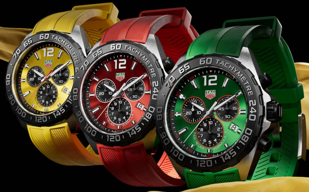 Con una cassa in acciaio ø 43 mm i tre nuovi cronografi, eredi dei Formula, presentano quadranti soleil e cinturini in caucciù nei colori che in passato caratterizzavano il mondo delle corse automobilistiche (verde racing, giallo per l’oro e rosso corsa) e che tuttora sono scelti da molti Team.