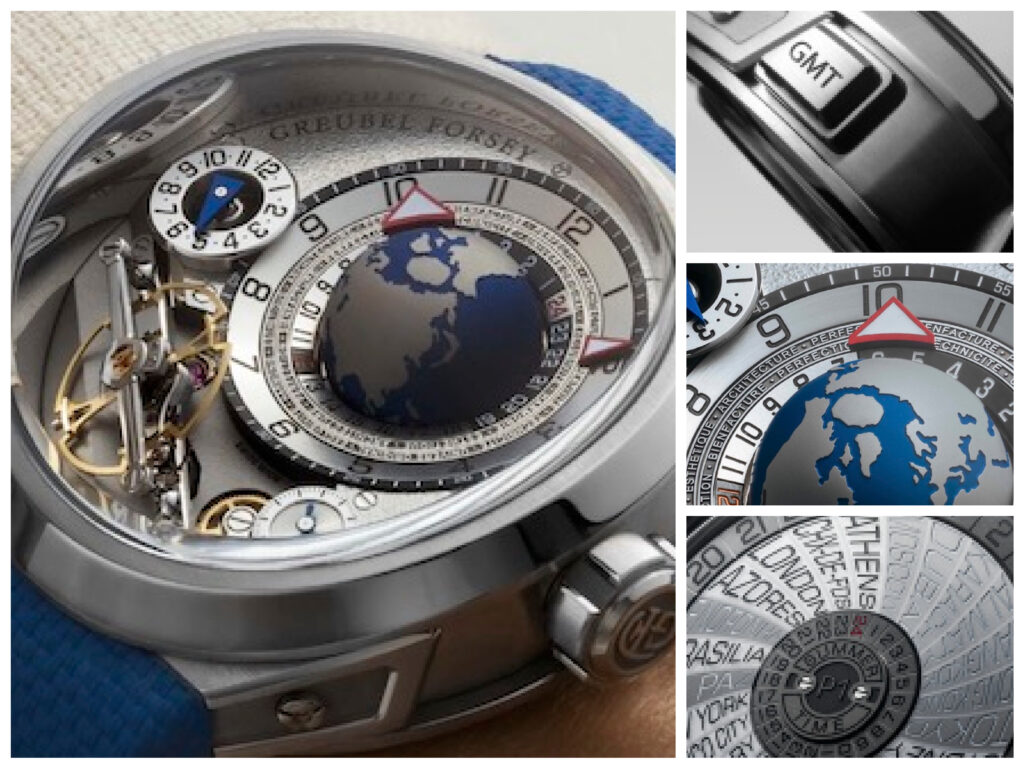 Nel nuovo orologio il quadrante fa la parte del leone con le 24 zone del tempo universale; il suo globo rotante è realizzato in titanio e reca incisi incisi continenti e oceani in blu; indica l’ora estiva e quella invernale, ha l’indicatore giorno/notte UTC in titanio inciso e laccato, quello del GMT è in oro; l’ora locale si legge su due anelli esterni (su quello grigio le ore su quello sottile e nero i minuti), le lancette si muovono su face circolari che recano incise parole che formano il credo della Maison, infine un quadrante decentrato alle 10 indica un secondo fuso orario con una lancetta in oro blu; sull’anello ad anfiteatro ore minuti incisi e laccati, la lancetta dei piccoli secondi è in oro blu.
