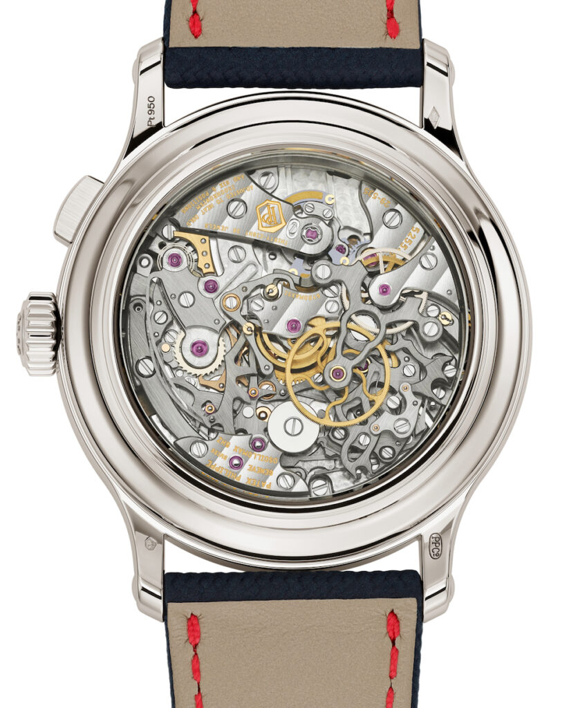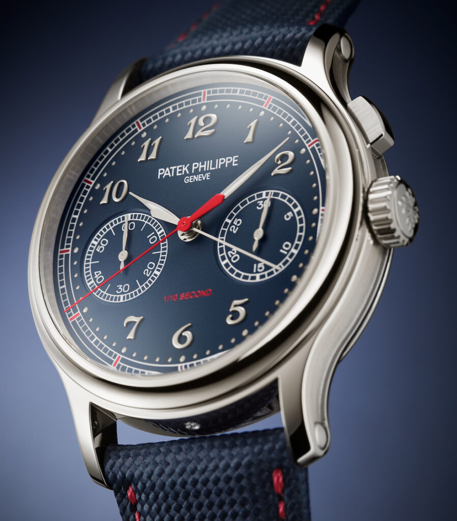 Nella cassa in platino ø 41 mm (con fondo in cristallo e pieno in platino, intercambiabili, w.r. a 3 bar, spessore da vetro a vetro mm 13,68, tra le anse il tradizionale diamante per il metallo della cassa), il nuovo movimento a carica manuale è stato dotato di due meccanismi cronografici indipendenti e di due lancette centrali, una consente di vedere con grande precisione i decimi di secondo. I tecnici. sono partiti dal calibro CH 29-535 PS, che dal 2009 abbina sei innovazioni brevettate all’architettura tradizionale (carica manuale, ruota a colonne, innesto orizzontale a ruote dentate), e dalla versione rattrapante, con due lancette cronografiche al centro, ma con una frequenza di 28.800A/h (4Herz) otto passi al secondo per ruotismo e lancetta, cioè un’indicazione a 1/8 di secondo; per arrivare al decimo occorreva una frequenza di 5Hz, cioè 36.000 A/h, presente in qualche cronografo, ma mai impiegata da Patek Philippe. Inoltre si voleva una. precisione assoluta nell’indicazione sul quadrante e non c’era spazio sufficiente per una scala a 1/10, da qui la decisione di avere due meccanismi cronografici indipendenti, uno per i secondi e il contatore 30 minuti istantaneo, l’altro dedicato solo alla misurazione e all’indicazione dei decimi di secondo. Per arrivare a questo risultato è nato un sistema concentrico; due lancette centrali cronografiche sono pilotate dai meccanismi indipendenti. Una effettua un giro in un minuto e fa leggere i secondi in modo tradizionale, l’altra, laccata rossa, compie un giro del quadrante in 12 secondi (cinque volte più velocemente rispetto a una lancetta dei secondi centrale tradizionale, percorrendo 12 settori suddivisi in decimi). I secondi trascorsi si vedono sulla minuteria perlata e il numero di decimi di secondo trascorsi (dall’ultima suddivisione in rosso) sulla scala a “chemin de fer” esterna mentre il numero dei minuti trascorsi appare a ore 3 nel contatore 30 minuti istantaneo.