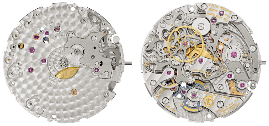 Per la prima volta, nella produzione corrente, è stato impiegato l’Oscillomax® sviluppato dall’ufficio tecnico “Patek Philippe Advanced Research” (dal 2011 riservato alla serie limitata del calendario perpetuo Patek Philippe Advanced Research Ref. 5550P) che comprende spirale Spiromax®, scappamento Pulsomax® e bilanciere Gyromax® in Silinvar® e oro; è stato così possibile conservare la precisione richiesta dal Sigillo Patek Philippe, con uno scarto di marcia massimo di –3/+2 secondi al giorno. Migliorata anche la protezione antiurto e perfetta la fluidità delle lancette (per quella dei decimi si è intervenuti sulle ruote con un’architettura innovativa a due stratI: una ruota superiore dotata di bracci flessibili e una inferiore con bracci rigidi. Le lancette cronografiche si sovrappongono perfettamente ed è stata inoltrata domanda di brevetto per il procedimento che migliora la tenuta della lacca su una superficie di silicio ossidato (Silinvar®) mediante il deposito (PVD o CVD) di un sottile strato aggrappante; un altro brevetto è stato chiesto per l’assemblaggio tra due materiali di base (uno dei quali non metallico) realizzando una “brasatura” del tubo sulla lancetta in Silinvar® grazie a un rivestimento metallico multistrato. Sono in oro bianco le lancette di ore, minuti, piccoli secondi e contatore 30′, in acciaio quella del cronografo e in Silinvar® laccata rossa. quella dei decimi. Il quadrante in ottone verniciato blu, protetto da vetro zaffiro, ha cifre arabe stile Breguet e minuteria perlata. In conclusione i brevetti del nuovo Calibro CH 29-535 PS 1/10 sono 31, comprendendo le sei innovazioni brevettate sul calibro CH 29-535 PS nel 2009, i 17 brevetti legati allo sviluppo dell’organo regolatore hi-tech Oscillomax® e alla spirale Spiromax® nel 2011 e i sette inediti di quest’anno.