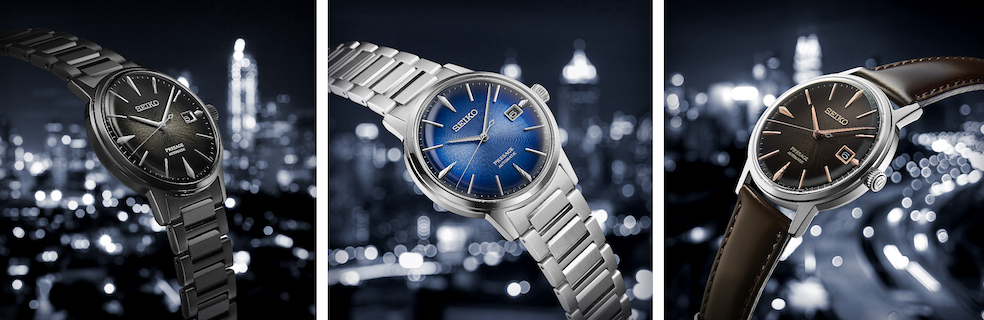 Presage Collection has three new ideas for dials of Tokyo Time Cocktails: automatic or manual self winding, steel case ø 39,5 mm.