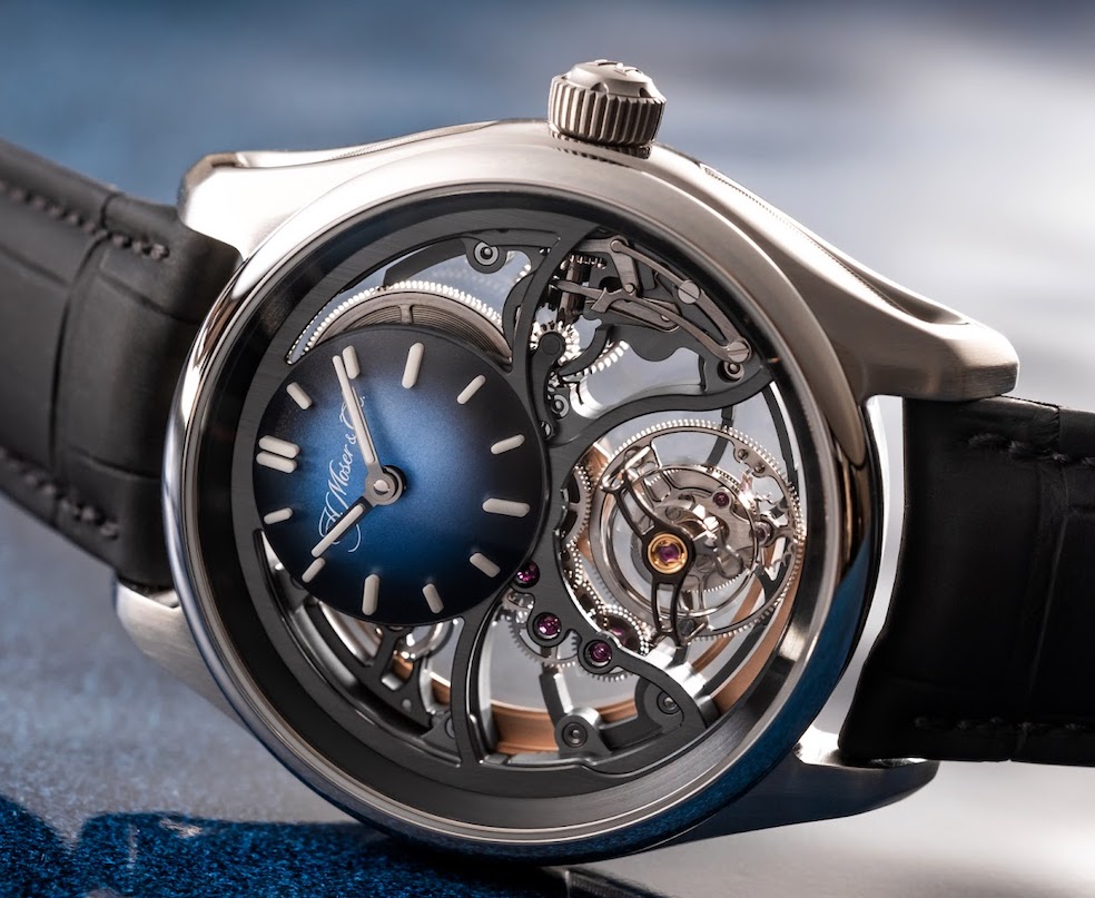 Here another article about H.Moser & C. novelty, new Cylindrical Tourbillon Skeleton with steel case and a nice blu funky fumé dial.