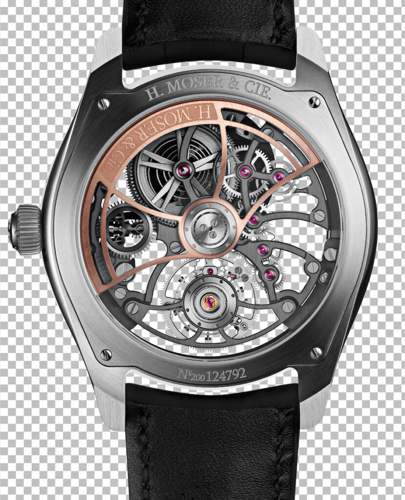 Il Pioneer Cylindrical Tourbillon Skeleton è un orologio che non passa inosservato. Sotto un vetro zaffiro leggermene bombato e un sotto quadrante altrettanto curvato “funky blue fumé” decorazione soleil con indici e lancette in Globolight® (materiale a base di ceramica). Il Tourbillon volante, la cui gabbia ruota in un minuto, è dotato di una spirale cilindrica, perpendicolare alla tigre superiore dell’asse del bilanciere (realizzata a mano da Precision Engineering AG, società sorella di H. Moser & Cie.) non una soluzione nuova visto che se ne trovano precedenti nell’antica orologeria nel XVIII sec., ma sicuramente innovativa nella moderna orologeria da polso