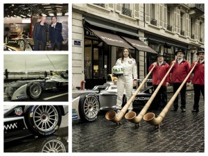 A Ginevra la promoxione di una vettura FE pilotata da Simona De Silvestro in città, Jean Claude Biver e Alejandro Agag CEO di Formula E Holdings