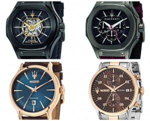 Maserati realizzati dal Gruppo Morellato,: collezione Fuoriclasse ø 42 mm, automatico con quadrante traforato e multifunzione; qui collezione Epoca, solo tempo e cronografo con movimenti al quarzo