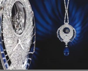Pendent Azur Mysterieux, esemplare unico con zaffiro ovale Ceylon (25,93 carati) staccabile; impreziosito con diamanti, zaffiri e onice, Calibro di Manifattura 9463MC carica manuale, doppio tourbillon