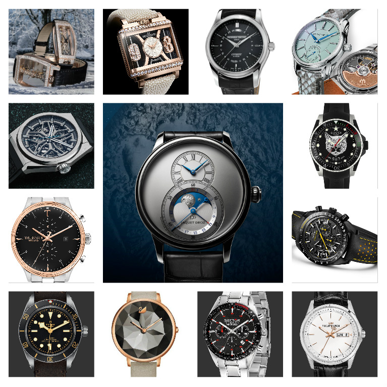 Corona di orologi intorno a Jaquet.Droz, dall’alto in senso orario Corum, De Grisogono, Frederique Constant, Gronefeld, Gucci, Omega, Philip Watch, Sector No Limits, Swarovski, Tudor, Trussardi, Zenith