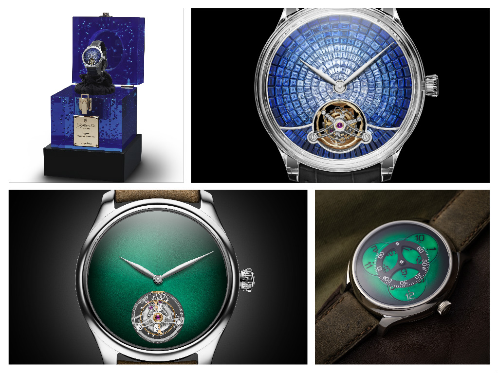 MOSER&Cie.: un pezzo unico d’alta gioielleria il Venturer Tourbillon Sapphire con cassa in zaffiro ø 41.5 mm, quadrante fumé con 264 zaffiiri baguette (8,12 carati). Calibro automatico bidirezionale HMC 802, A/h 21.600, rubini 29, massa oscillante in oro decorata, carica 3 gg; tourbillon con ponti scheletrati. Normalmente non mettiamo mai i prezzi, ma per questo modello facciano un’eccezione: costa CHF 1.200.000. Tra gli Endeavour del 2019 ricordiamo il Cosmic Concept Green Tourbillon con quadrante fumé e il tourbillon volant in forma di modulo, Calibro di Manifattura automatico HMC804, cassa in oro bianco ø 42 mm, prodotto in 50 esemplari con quadrante verde e l’automatico Flying Hours del 2018, con disco centrale in zaffiro per i minuti e tre dischi per le ore, prodotto quest’anno in due versioni (quadrante blu fosforescente o cosmic green) in tirature limitate a 100 esemplari.