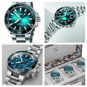 ORIS: Questa Maison ha atteso Giugno per presentare i 200 esemplari numerati dell’Ocean Trilogy dedicata alla salvaguardia del mare e che comprende l’Oris Clean Ocean, l’Oris Great Barrier Reef con data analogica e il cronografo Oris Blu Whale con movimento automatico, cassa in acciaio w.r.a m.500 che sul fondello ha incisa la balena blu. I due automatici solo tempo, acquistabili anche separatamente e realizzati in 2000 esemplari, hanno le casse w.r.a m.300 ø 39,5 mm o 43,5 mm con fondelli dedicati e quadrante blu.