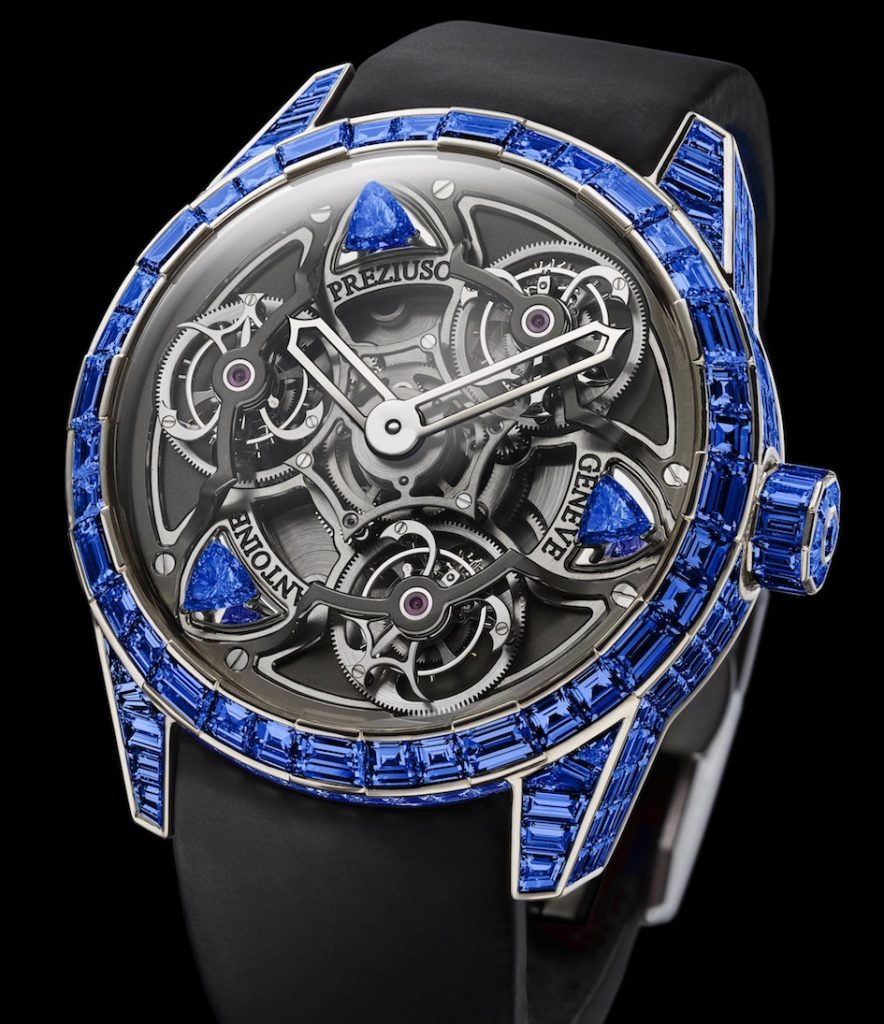 Partendo dalla grande tecnica del Tourbillon des Tourbillons, realizzato insieme al figlio Florian, Antoine Preziuso ha incastonato in modo invisibile zaffiri blu Royal (233 pietre baguette pari a 24 carati) nel suo nuovo pezzo unico con cassa in oro bianco, ø 47 mm, impreziosendo ulteriormente il movimento meccanico coperto da brevetti.