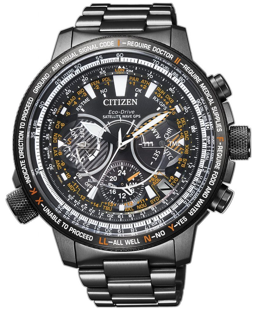 Questo orologio professionale con regolo calcolatore aeronautico, ha la cassa, ø 47 mm w..r.a 20 bar, in SupertitanioTM come il bracciale. Sul fondello sono incisi il logo del 30° anniversario e il numero di serie. Nel design si ispira alla cabina di pilotaggio e alla strumentazione a disposizione dei piloti. sul quadrante a 5 livelli dei componenti meccanici, le lancette sono posizionate tra i livelli; sulla ghiera i segnali di soccorso terra-cielo. Il movimento è il Calibro F990 Eco-Drive (a carica completa in modalità di risparmio energetico funziona per 5 anni) con margini di tolleranza di +- 5 secondi al mese, dotato della tecnologia Satellite Wave GPS. Rispetto alle precedenti versioni la velocità di rotazione delle lancette di ore e minuti nella regolazione dell’ora locale è stata raddoppiata. Il segnale orario da un satellite GPS (ora e data per le 39 città indicate) si riceve in un minimo di 3 secondi; indicazione simultanea di due fusi orari; il cronografo al secondo misura 24 h; il livello di luce su 7 livelli mostra l’intensità della luce sul quadrante.