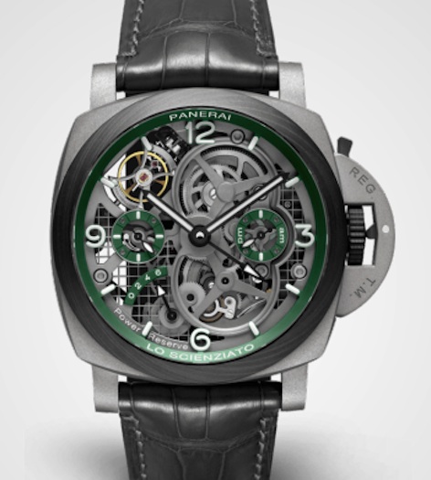 Per quanto ricordiamo Rolex è stato in passato il primo a privilegiare il colore verde, adesso è la volta di Panerai che, dopo i Radiomir Green, presenta lo Scienziato Tourbillon GMT con dettagli verde e movimento scheletrato, cassa in titanio spazzolato, ø 47 mm, fondo in vero zaffiro, lunetta in carbotech, Calibro P20057T made in house, 31 rubini, 28.800 A/h, riserva di carica 6 gg grazie a tre bariletti. L’impiego del titanio nella cassa realizzata in 3D ha consentito di ridurre il peso del 40% arrivando a 96 gr, mentre per il movimento in titanio si è arrivati a una riduzione del 35° rispetto alla versione P/2005/5. Da notare anche che per una maggiore precisione la gabbia del tourbillon ruota su un asse che non è parallelo, ma perpendicolare a quello del bilanciere e compie una rotazione ogni 30″.