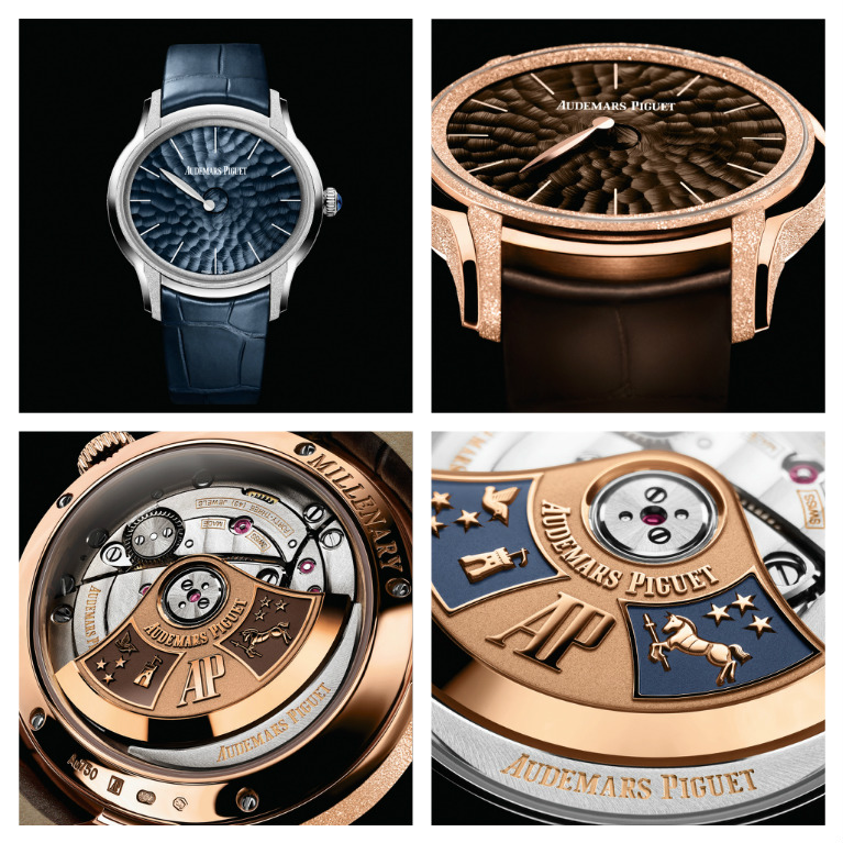 Nel nuovo Millenary bello il trattamento dell’oro, rosa o bianco, martellato (tecnica di Carolina Bucci designer fiorentina che fa assumere alla superficie satinata del metallo rifrazioni luminose come accade nei diamanti); le colorazioni del quadrante, blu o marrone, seguono le più attuali tendenze cromatiche; nella collezione presentata in gennaio al S.I.H.H. sino stati ammirati i quadranti in vetro avventurina (quel vetro nato per caso a Murano dove nell’impasto caddero pagliuzze di metallo); l’accenno nel nome alla filosofia nel tempo – scelta di Audemars Piguet già nei primi anni ’80 con il Philosophique a carica manuale e cassa tonda – rende il modello senza dubbio intrigante. Per chi ama i movimenti meccanici è interessante il Calibro automatico 3140, brevettato, con la lancetta delle ore che si sposta con una traiettoria ellittica; la ruota delle ore combacia con un disco trasparente sul quadrante e su questo disco è montata la lancetta delle ore; semplice come l’uovo di Colombo? forse, ma bisognava pensarci.