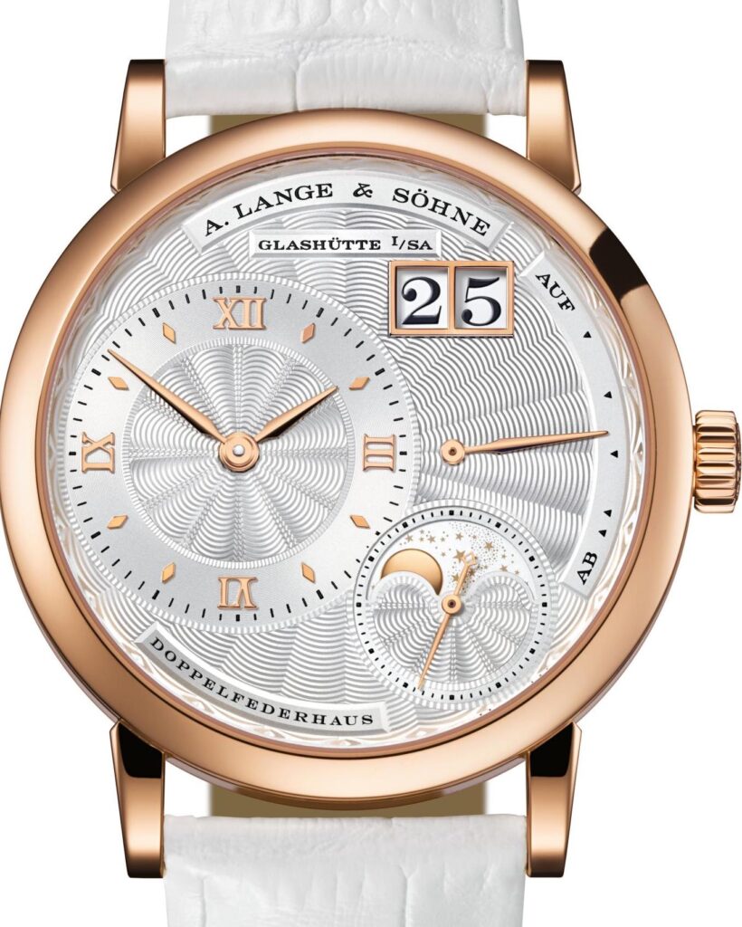 A.LANGE&SOEHNE – Il nuovo Lange 1 Fase Lunare in oro rosa ø 36,8 mm più piccolo del precedente (ø-1,7 mm) ha un quadrante accuratamente lavorato a guillochage, il movimento di Manifattura (spirale compresa) a carica manuale si basa sul movimento presentato due anni or sono, il doppio bariletto (carica 72 h) vede lo scarto di un giorno sulla precisione della luna dopo 122,6 anni.
