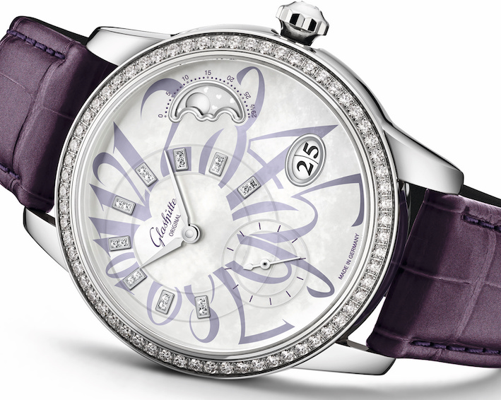 GLASHUTTE ORIGINAL Il Panomatic Lunar, con movimento di Manifattura, sceglie tonalità glicine per questo automatico in acciaio impreziosito da 64 diamanti sulla lunetta, ha una decorazione particolare sul quadrante, oltre alla finestrella della luna con cuoricini, la posizione degli indici forma un cuore.