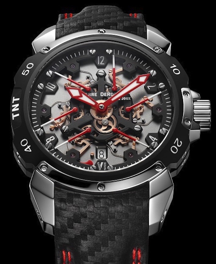 Pierre DeRoche ha realizzato un TNT in veste sportiva e l’ha chiamato Diablo; questo automatico, in edizione di 101 esemplari, è equipaggiato con un movimento esclusivo Dubois-Dépraz, 58 rubini e su un settore suddiviso in dieci parti le 6 lancette a retrograde dei secondi; cassa in acciaio ø 43 mm w.r. a m.100,