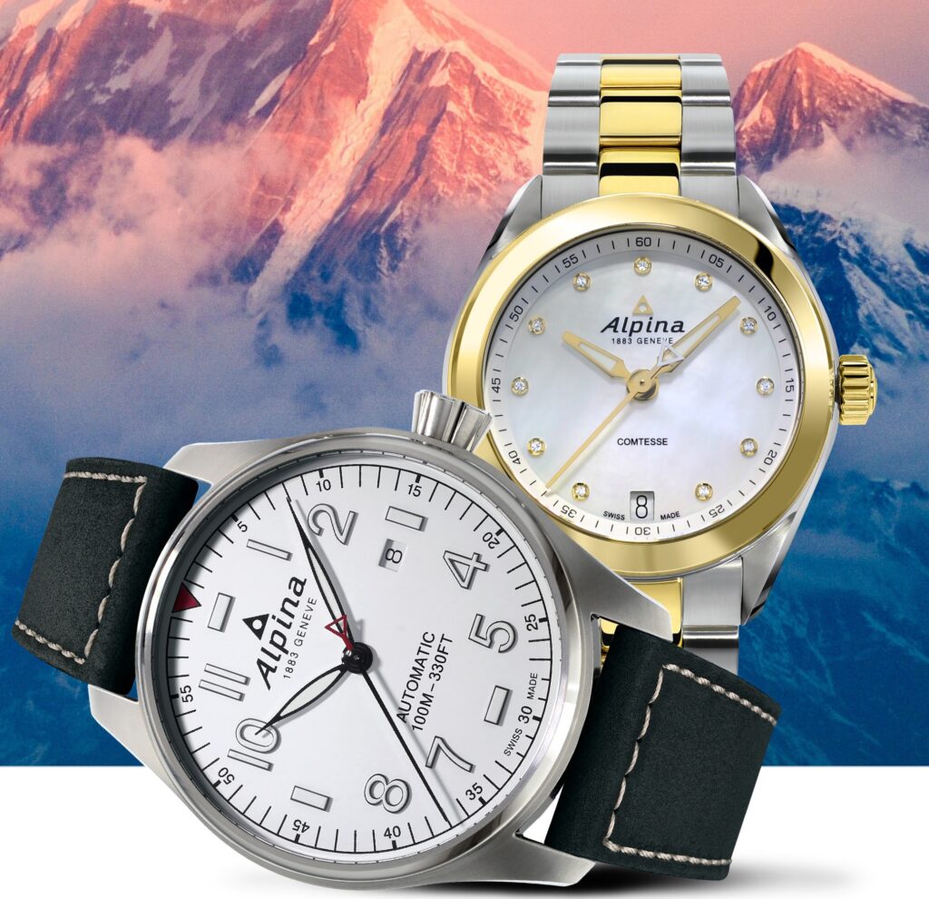 Concludiamo con Alpina che sullo sfondo delle Alpi (potrebbero anche essere le Dolomiti visto il colore rosato) ha posizionato il modello Comtesse bicolore al quarzo con indici in diamanti (ma esiste anche tutto in acciaio e con indici a bastone) e l’automatico maschile cassa in acciaio w.r.a m.100.