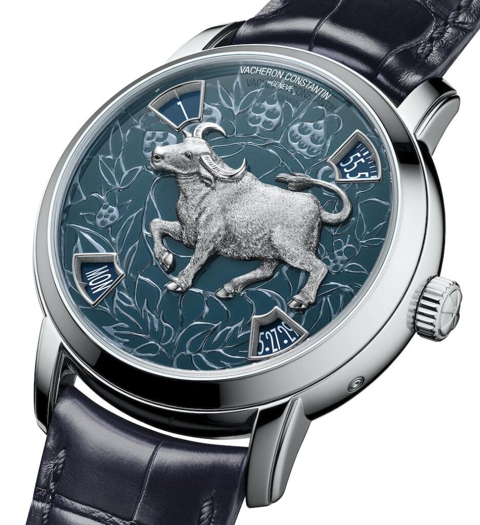 Comunque sia, Vacheron Constantin, come negli ultimi anni, ha scelto il movimento automatico Calibro 2460 G con ora, minuti, giorno della settimana e data visibili da 4 finestrelle, massa oscillante in oro impreziosita dalla croce di Malta e fondo in vetro zaffiro; cassa in platino o in oro rosa ø 40 mm. Per i modelli del 2021 gli artisti della Maison si sono esibiti in due quadranti in oro cesellato a mano e smaltato Grand Feu con un motivo di fondo sul quale spicca la figura del bue in platino su fondo blu o in oro rosa su fondo rosa, Entrambi i modelli, realizzati in 12 esemplari, hanno il Punzone di Ginevra.