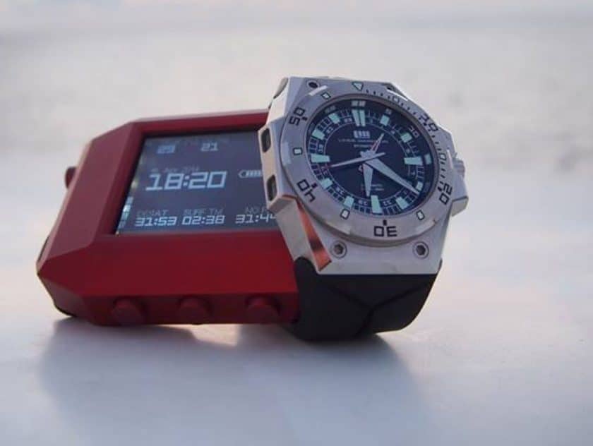 Al segnatempo con movimento meccanico spesso affiancano uno strumento digitale che si collega alla cassa ed è in grado di fornire informazioni sulle condizioni meteo, utili per chi si trova in alta montagna o nelle profondità oceaniche. Nella foto sotto il 3 Timer Rock Gold limitato a 33 esemplari, cassa in acciaio w.r a m.300 ø 44 mm con funzione GMT quadrant4e guilloché .