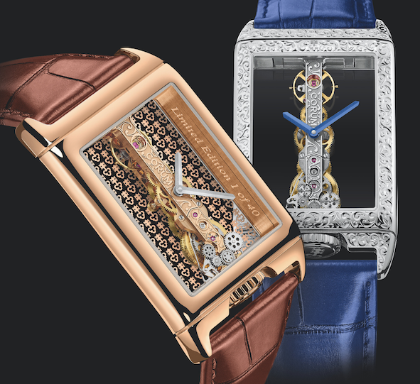L’orologio dell’Anniversario riprende la cassa rettangolare originale, realizzata in oro bianco finemente decorata con motivi tradizionali di La Chaux-de-Fonds mentre quella in oro rosa può essere decorata o levigata e con il fondo che mostra un susseguirsi del simbolo lo dell’azienda, la chiave, intesa come “la chiave perfetta del tempo” mentre il nome Corum pare derivi dal latino Quorum. Solo tre gli esemplari per ogni versione, tanti infatti erano i personaggi dell’azienda, fondata nel 1955 da Gastone Reis (che già dal 1924 dirigeva una piccola impresa fornendo orologi ad altre Marche e che morì nel 1958) da sua figlia Simon e dal nipote René Bannwart stimato designer che aveva già lavorato per Patek Philippe e poi per Omega.