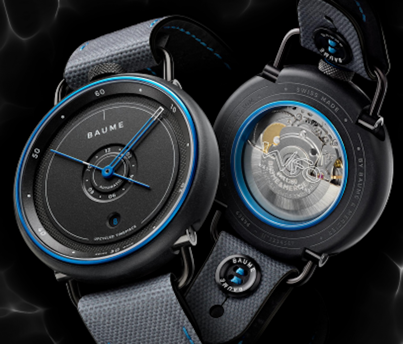 Nella foto sopra, la versione blu della collezione Baume Ocean; la cassa ø 42 mm è realizzata con un rivestimento in plastica riciclata prodotto dall’ONG WFO (all’80% della plastica è stato aggiunto un 20% di fibre di vetro per aumentarne la resistenza) inserito in un involucro in alluminio anodizzato blu o verde. Sul quadrante grigio scuro a più livelli, réhaut in alluminio colorato e lancette nello stesso colore; il movimento a carica automatica è il Calibro svizzero SW-200 visibile dal fondello; cinturino ecologico RPET grigio con cuciture blu o verdi, bordi ripiegati neri e rivestimento in sughero naturale. Sono già disponibili online e su alcuni siti partner; il 2% del ricavato delle vendite di ogni modello Baume e il 5% dei Baume Ocean sarà devoluto a ONG, tra le quali Waste Free Ocean.