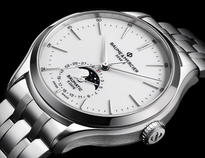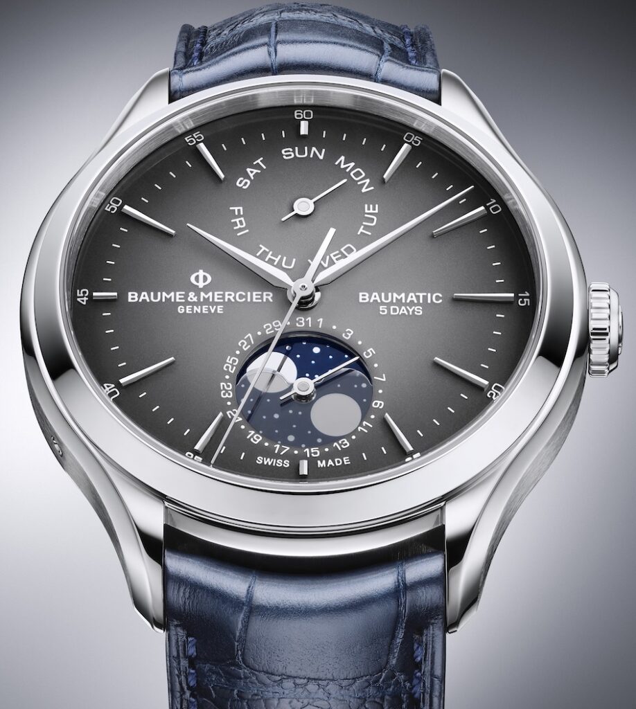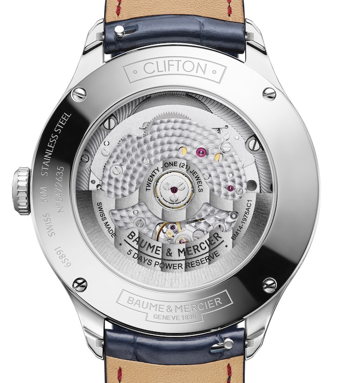 Più tradizionale la proposta del Clifton Baumatic, novità 2020, con la cassa in acciaio inossidabile lucido e satinato, ø 42 mm, vetro zaffiro anche sul fondo per ammirare il movimento automatico di Manifattura (Calibro Baumatic BM14 1975 AC2) autonomia 5 giorni, con la platina sabbiata e decorata a chiocciola, ponti lavorati a perlage e massa oscillante ajourée decorata a Côtes de Genève, incisione della Marca; spessore 5,7 mm, A/h 28.800 e 21 rubini.
