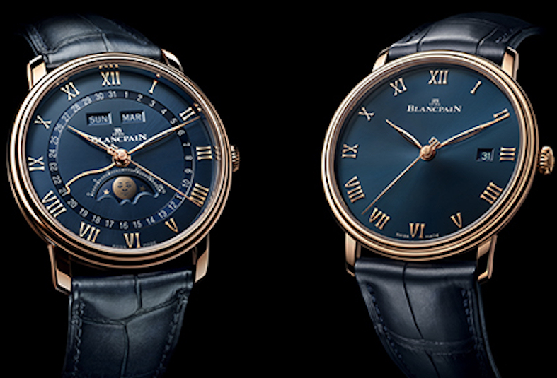 Un quadrante blu notte, la tinta più trendy degli ultimi mesi, distingue un Calendario Completo con fasi di luna e un Ultrapiatto, entrambi con cassa in oro rosso e movimenti automatici. Nel primo, mese e giorno appaiono da finestrelle mentre la data è analogica; a ore 6 sorride una grande luna; il movimento automatico è il Calibro 6654, spessore mm 5,50, i rubini sono 28, la carica di 72 h, i correttori delle funzioni, collocati sotto le anse, si azionano con un dito e non con il tradizionale attrezzo. La cassa in oro rosso ø 40 mm con fondo in vetro zaffiro, ha uno spessore di mm 10,94.