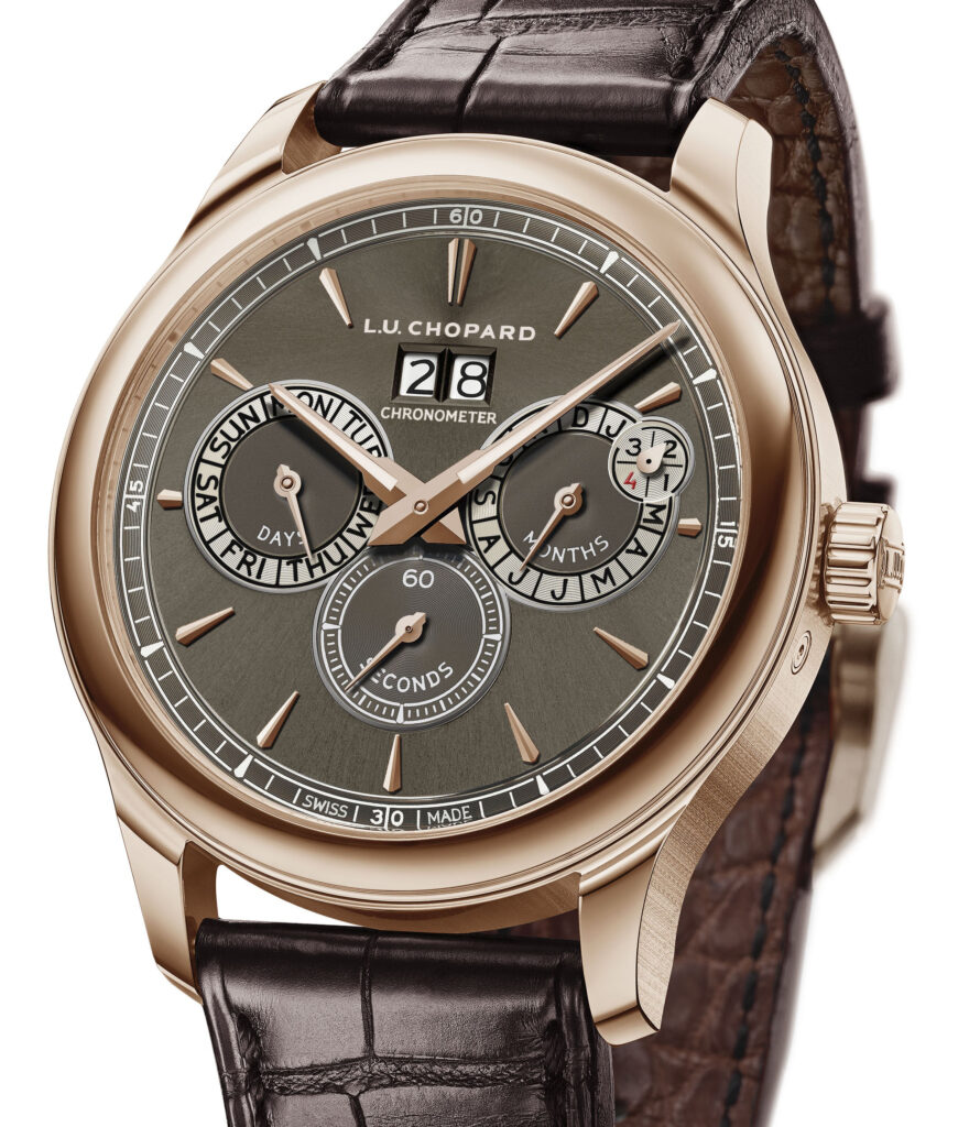 L’emergenza sanitaria ha annullato l’edizione 2020 della Mille Miglia storica, comunque la collezione dei cronografi automatici dedicati a questa splendida manifestazione che Chopard sostiene da tempo immemorabile, si è arricchita della versione, pubblicata sopra, con quadrante blu, mentre sotto pubblichiamo il L.U.C. Perpetual Twin, presentato quest’anno, con calendario perpetuo in oro rosa e quadrante grigio rutenio (ma è disponibile anche in acciaio con quadrante blu), grande finestrella della data, indicazione del quadriennio; movimento automatico certificato cronometro dal COSC, visible dal fondello, con microrotore in oro 22 carati, 65 ore di carica grazie a due bariletti.