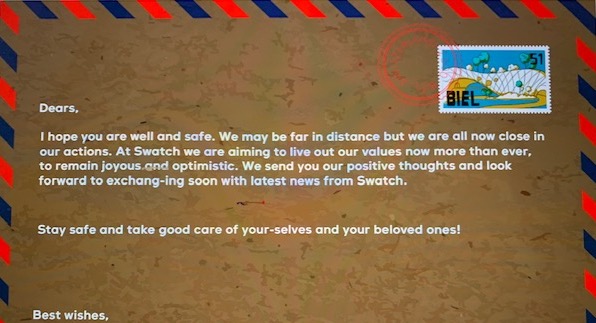 On March 2020 postcard I wrote and posted in Patek Philippe stand at Baselworld arrived, today another one digital, in real Swatch style, arrived by e-mail.