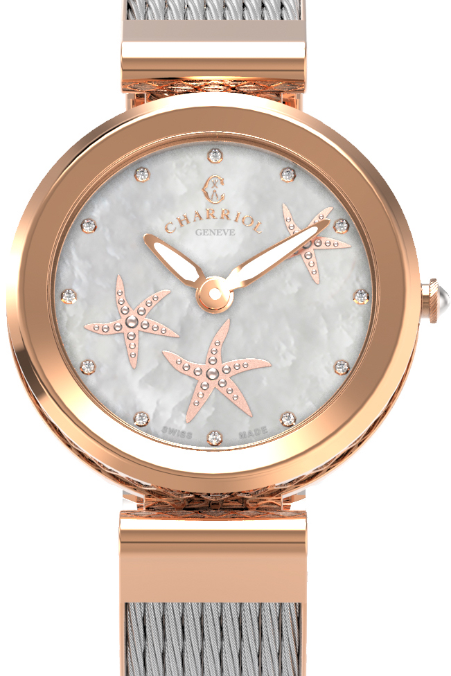 A new Charriol lady watch inspired by Ocean and nature, is available since next October; stainless case o 35 mm or PVD yellow or rose gold line iconic bracelet.