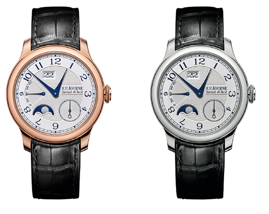 P.F.JOURNE presenta, nella collezione Octa nata nel 2001, una nuova versione dell’Octa Lune Automatique. Pensando alla clientela che può permettersi questi orologi, non solo economicamente, ma soprattutto anagraficamente, sul quadrante silver la finestrella della data è stata ampliata e adesso misura mm 4,7×2,6; più grande anche la luna in zaffiro. La cassa, ø 40 o 42 mm, è in oro rosa o in platino con cinturino in pelle o bracciale nel metallo della cassa. Il movimento, Calibro FP1300.3 è in oro rosa, ha una carica di 5 gg grazie al rotore decentrato in oro 22 carati, A/h 21.600, 36 rubini, bilanciere a inerzia variabile con 4 masse di compensazione.