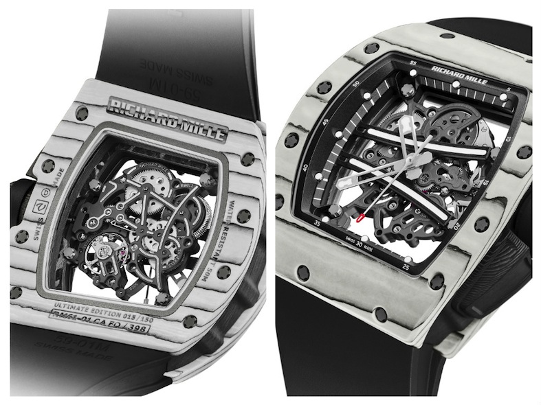 RICHAR MILLE avverte i suoi fans che la collezione dei tourbilon RM-61 sta per concludersi con una tiratura speciale di 150 esemplari RM-61-01, con cassa, lunetta e fondello in Quartz TPT® e al Carbon TPT®; movimento scheletrato in titanio grado 5 trattato PVD; anche i ponti sono in titanio grado 5 e il rivestimento galvanico nero è dipinto a mano. Le A/h sono 28.800, il bilanciere è a inerzia variabile, la carica arriva a 55 ore.