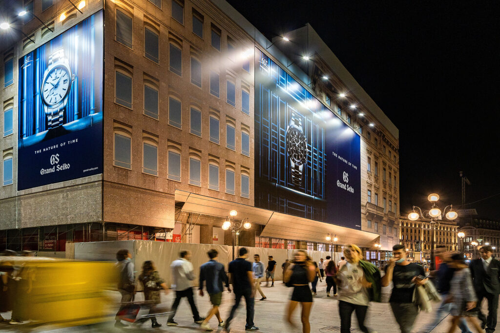 L’impianto pubblicitario dei Grand Seiko è stato posizionato dalla Acone Associati su palazzo Venezia (1200 mq) riproducendone le facciate originali diventate lo sfondo di tre orologi. Il palazzo fu costruito fra il 1897 e il 1901 dalle Assicurazioni Generali Venezia, su disegno dell’architetto Luca Beltrami.