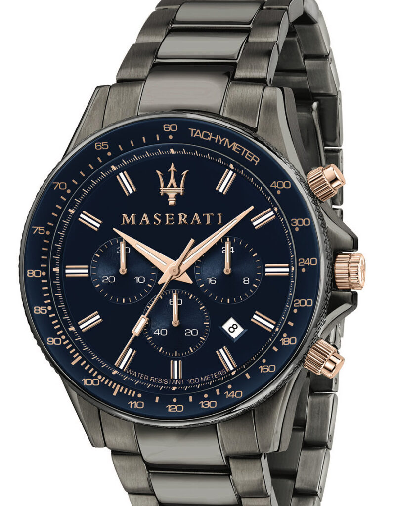 COLLEZIONE SFIDA Ref.R8873640001: cronografo in acciaio trattato PVD canna di fucile, cassa ø 44 mm w.r. a 10 ATM, lunetta trattata PVD blu con dettagli color oro rosa. Il quadrante è nella tinta più trendy, il blu, sul quale risaltano analoghi dettagli cromatici; il bracciale in acciaio PVD canna di fucile alterna maglie lucide e opache.
