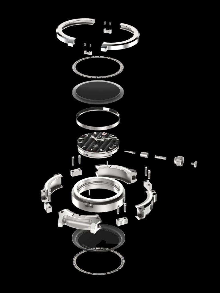 I due imprenditori la definiscono una complicazione dell’assemblaggio e sin dall’inizio hanno studiato le superfici dei metalli impiegati lasciando da parte il tradizionale impiego di giunti, atti a garantire che l’orologio sia ermetico. Gli studi e i test di laboratorio, partiti dall’esame dei rivestimenti per le piscine olimpioniche, hanno portato a campioni di materiali induriti e poi opportunamente rettificati con superfici dalla rugosità controllata e perfettamente levigate.