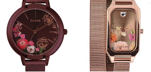 Quadranti primaverili con bouquets di fiori, ma due casse in acciaio diverse: alla tradizionale forma rotonda, ø 32-34-38 mm anche in dimensione mini ø 28 mm, si affianca il rettangolo allungato con un bracciale mesh che si arrotola due volte intorno al polso. Cinturini in plastica o pelle riciclata e movimenti al quarzo.
