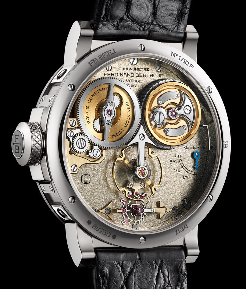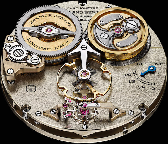 Il movimento a carica manuale è il Calibro FB-RE.FC, forza costante con trasmissione a fuso e catena con fuso e bariletto sospesi, cioè fissati su un solo punto della platina; due i brevetti ottenuti: uno per il fuso (sistema di differenziale di carica) e uno per il bariletto (sistema di arresto a Croce di Malta); la catena è composta da 790 elementi ed è lunga mm 285; il remontoir d’egalité ha un dispositivo di arresto dei secondi (secondi morti) che ferma il bilanciere quando la corona è estratta garantendo la massima precisione cronometrica durante la messa all’ora sincronizzata con un orologio di riferimento. Bilanciere Ferdinand Berthoud a due bracci e inerzia variabile, A/h 18.000, 26 ponti in alpacca, di forma particolare, fissati su 10 pilastri in acciaio che trattengono gli organi meccanici, così come accadeva nei cronometri da Marina di Berthoud.