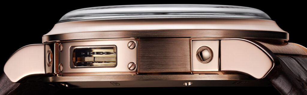 La cassa, ø 44 mm, in oro rosa o bianco con un oblò sulla carrure a ore 10 (per ammirare l’architettura a pilastri, il bariletto e la catena) ha una grande corona dinamometrica (sistema di disaccoppiamento) con medaglione di ceramica nera; il sobrio quadrante nero o bianco a due livelli in smalto Gran Feu con analoghi indici e il nome della Marca completato da “Chronomètre Val de Travers Suisse”, ha lancette ore e minuti in oro bianco o rosa azzurrato, è azzurrata anche quella della riserva di carica sul retro dell’orologio; la lancetta centrale dei secondi, che pesa 0,01 grammi riducendo così il peso trascinato dal remontoir, è in titanio dorato per la versione in oro rosa e azzurrato per quella in oro bianco; il vetro zaffiro bombato è a cupola, il fondo cassa a vite è in vetro zaffiro.