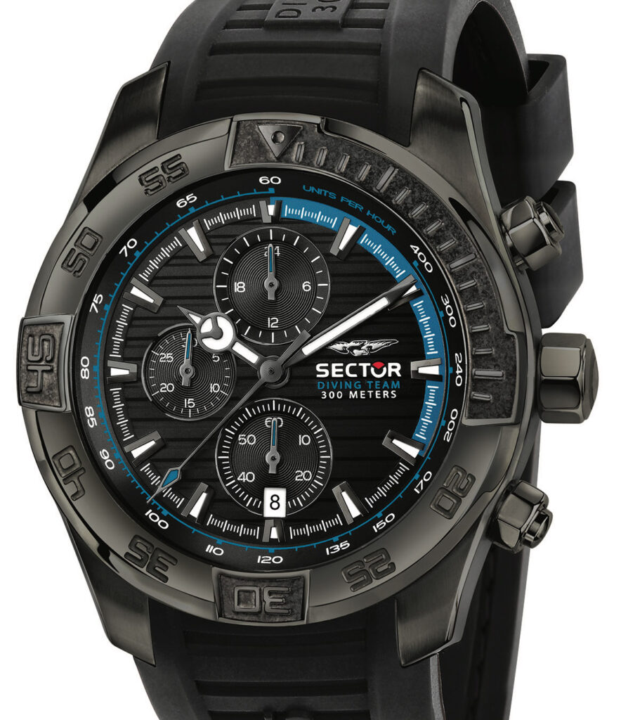 SECTOR – Disponibile a un prezzo particolarmente accessibile, adeguato al grande pubblico, questo cronografo ha la cassa in acciaio finitura silver o IP black, ø 45 mm e w.r. a 30 ATM, è dotato della valvola per il gas elio ed è equipaggiato con un movimento al quarzo, il quadrante è blu o nero guillochÉ con indici e lancette luminescenti; può essere scelto con bracciale in acciaio o cinturino in silicone con cuciture a contrasto e logo.