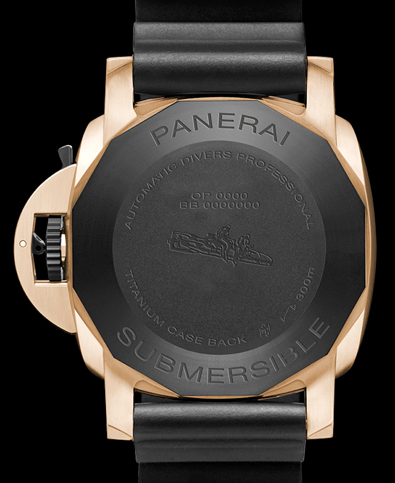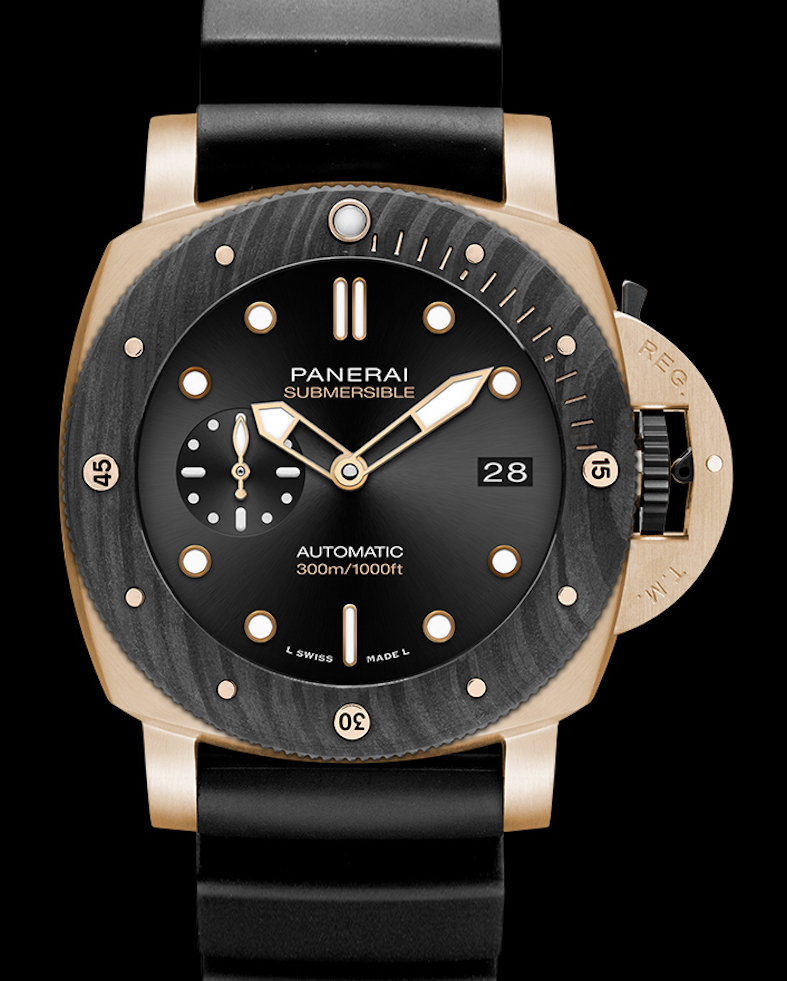 PANERAI il Submersible 44 mm w.r. a m.300, è realizzato per la prima volta impiegando due materiali il Panerai GoldtechTM e il CarbotechTM; il primo è una lega di oro e rame con un sensibile arricchimento di platino che dona alla cassa una colorazione particolarmente duratura, il secondo è un materiale composito impiegato per la lunetta unidirezionale, alternandone le fibre di carbonio.