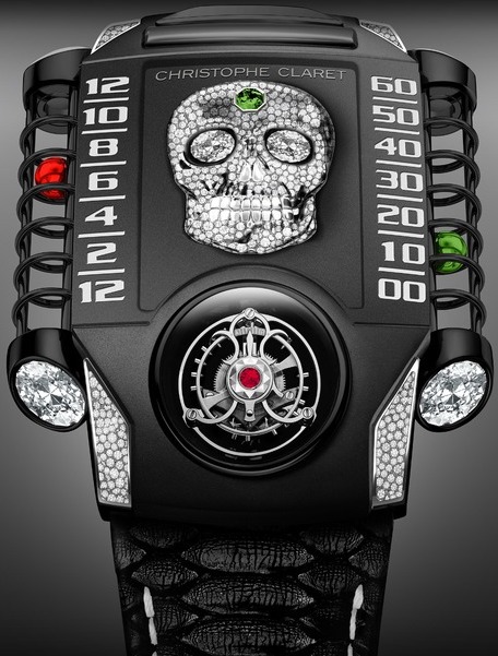 La più recente versione dell’X-Tream 1, che Christophe Claret realizzò nel 2012 migliorandolo poi di volta in volta, si ispira alla cultura dell’antico Messico, nella quale si mischiano anche dettagli legati alla festa di Hallowen come il teschio, i rubini color sangue, il titanio nero, mentre il trascorrere del tempo ha i colori della bandiera messicana. Il movimento è il calibro FLY11 a carica manuale con Tourbillon volante inclinato a 30°, 64 rubini, 21.600 Ah e due bariletti, uno per i ruotiamo del movimento e uno per l’indicazione del tempo. Come è noto il sistema di alimentazione magnetica si basa su due minuscole sfere in acciaio, non collegate meccanicamente al movimento, che si muovono in tubi a griglia collocati ai lati dell’orologio e trainati da due “carrelli” magnetizzati tirati da fili in nanofibre e gel di polietilene. Il diametro di questi fili, vere micropulegge, è inferiore a un capello, ø quattro centesimi di millimetro; resistenza alla trazione: un chilo. La tecnologia brevettata è stata sviluppata con l’Haute Ecole d’Ingénierie de Gestion del Cantone di Vaud a Yverdon-le-Bains (HEIG-VD).