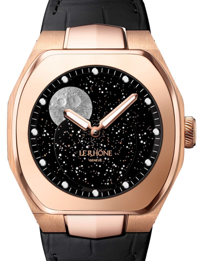 La Moön Collection di Le Rhöne presenta, insieme al Raconli Group, un modello in oro rosa o acciaio ø 41 mm (o 37 mm e c’è anche una versione in titanio nero con 56 diamanti); il quadrante stellato, grazie all’avventurina è stato definito “cosmico”, ma si può scegliere anche il quadrante nero in vetro zaffiro; alle 11 ha una grande finestrella per la luna, complicazione realizzata in house; il movimento è a carica automatica. La produzione del giovane marchio, fondato a Ginevra nel 2013 da Loïc Florentin e Timo Rajakoski, non solo è svizzera al 100%, ma assicura una completa tracciabilità grazie alla tecnologia blockchain e alla stretta collaborazione con Respect Code dallo scorso Agosto. Inoltre si pensa di ampliare la garanzia dai due anni tradizionali a otto o più.