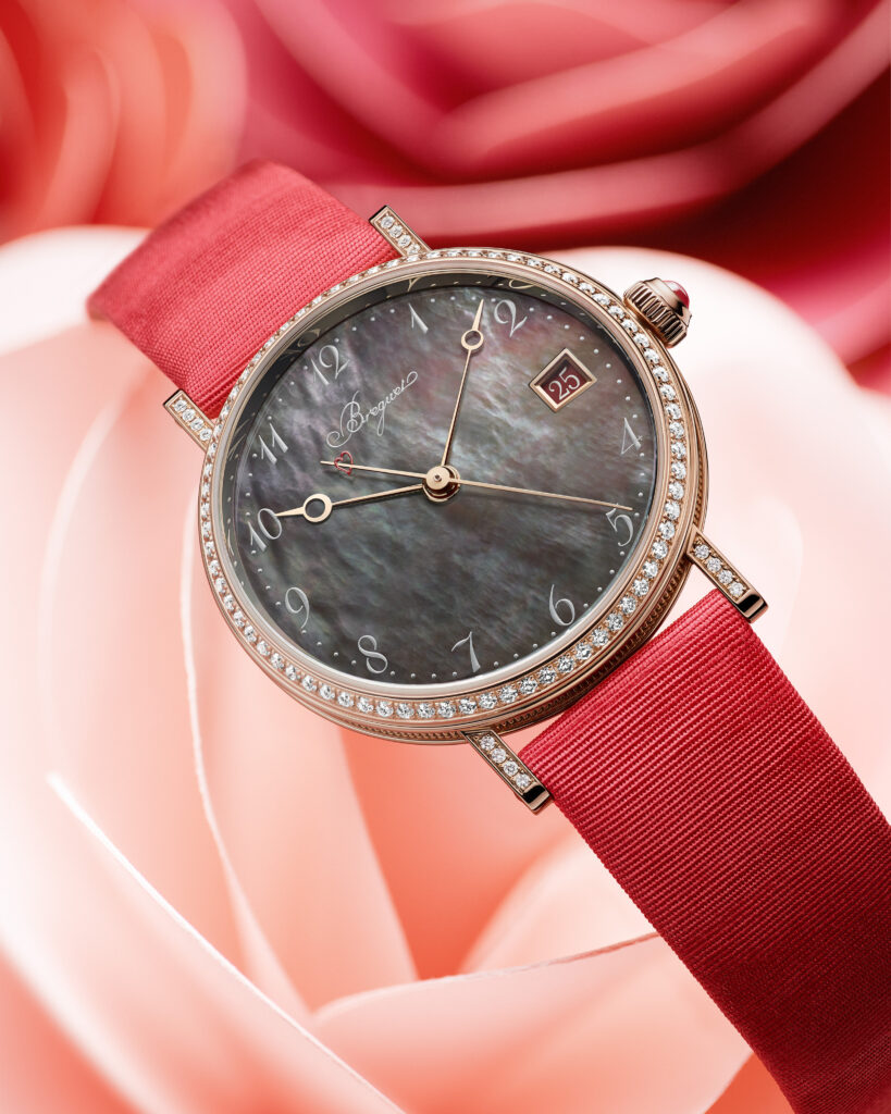 Noblesse oblige è un detto che si affianca bene alla produzione Breguet, il nuovo Classique Dame in oro rosa con 88 diamanti, non è proprio un orologio per San Valentino, ma i dettagli rossi possono indurre all’acquisto un innamorato (sufficientemente facoltoso). Il quadrante è in madreperla di Tahiti, nella corona c’è un rubino e il fiammante cinturino in raso rosso cangiante completa un’estetica raffinata; sotto il profilo squisitamente orologiero il movimento è il Calibro automatico 5981A; solo 28 gli esemplati.