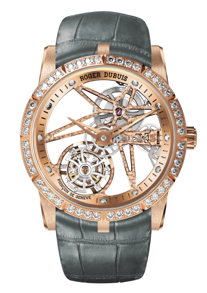 Restando nel campo dell’Alta Orologeria il Tourbillon volante squelette di Roger Dubois, alloggiato in una cassa in oro rosa ø 36 mm cattura l’attenzione con il suo aspetto stellare del quadrante scheletrato e la luminosità dei diamanti; il movimento certificato Punzone di Ginevra è il Calibro manuale RD510SQ.